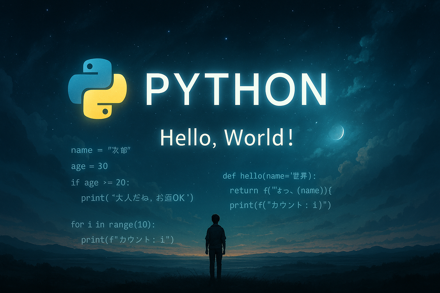 print("Hello, World!")1行で完了。他の言語だと面倒くさいのに、Pythonは優しいよな〜。 実行したら画面に挨拶出る。感動の儀式だぜ。